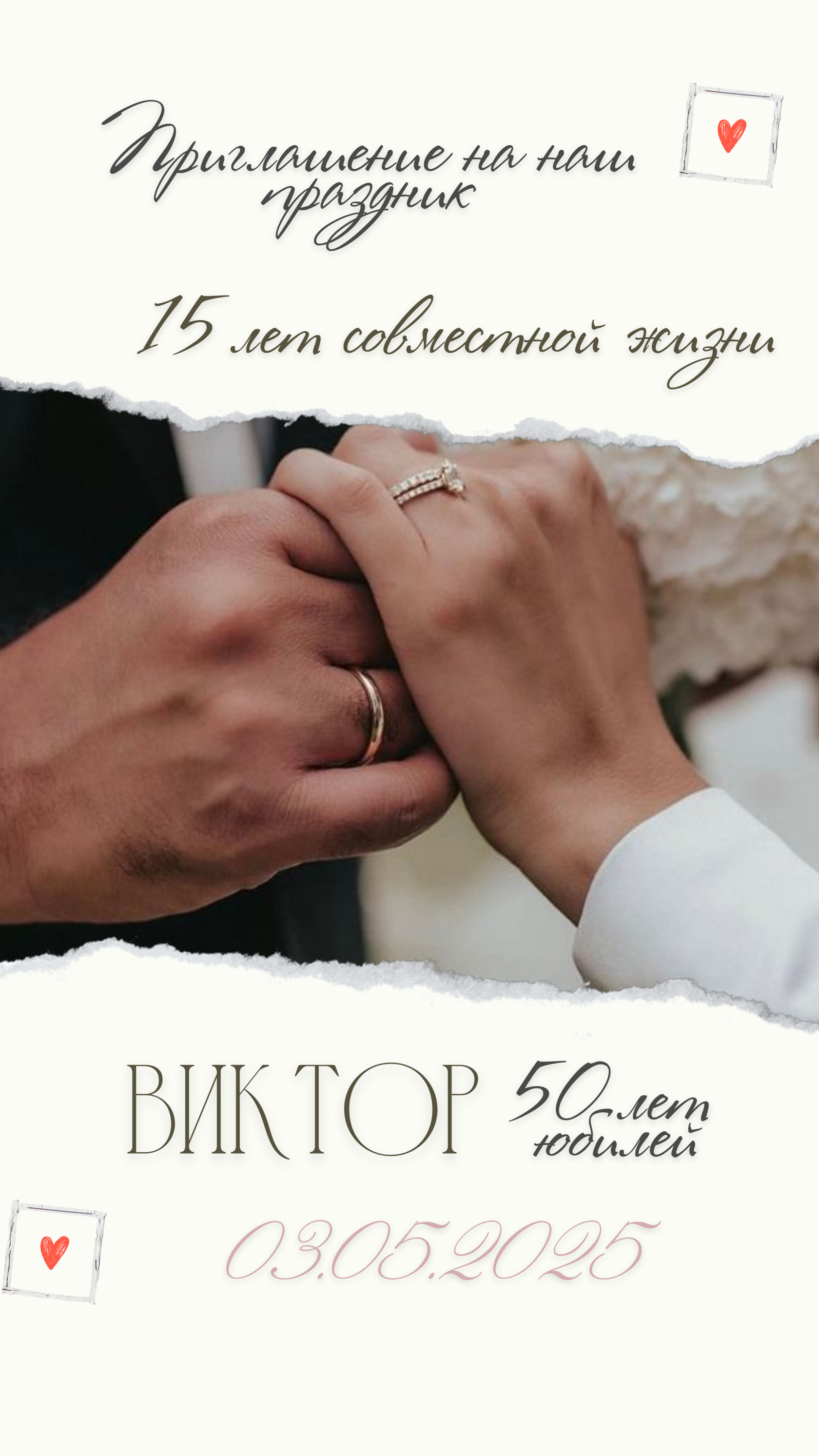 Приглашаем вас разделить с нами важное событие — юбилей Виктора (50 лет) и наш совместный праздник — 15 лет вместе!